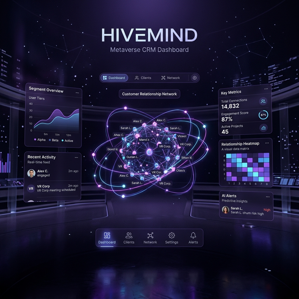 Hivemind bridges the gap between traditional CRM tools and immersive environments, offering a spatial interface for managing complex global client networks and project lifecycles within the metaverse.